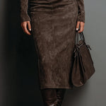 A strukturált magas nyak és a hosszú ujjú kivitel megkülönböztető és meleg érzetet ad, míg a midi hossz a nőiességet hangsúlyozza, kifinomult és sokoldalú légkörrel.
