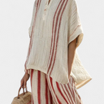 Tengerparti relaxáció. A Daisy öltöny egy laza, V-nyakú blúzt kombinál széles, függőleges csíkos nadrágokkal, amelyek meghosszabbítják a sziluettet. Folyékony dizájnja és textil anyaga ideális választás a napos napok élvezetére kényelmesen és stílusosan.