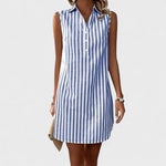 Klasszikus csíkok – A kék-fehér csíkok meghosszabbítják a sziluettet, és időtlen megjelenést kölcsönöznek a ruhának
