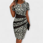 Emelje ki sziluettjét ezzel a figyelemfelkeltő ruha leopárdmintával, amely modern dizájnt ötvöz nőies kulcsformájú dekoltázzsal.