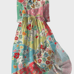 Fedezze fel hosszú ruháink varázsát! Ez a lenyűgöző ruha játékos patchwork mintával rendelkezik élénk színekben, amelyek rózsaszínt, zöldet, kéket és sárgát kombinálnak. Egyedi dizájnja virágokkal és pöttyökkel retro hangulatot és különleges bájt kölcsönöz.