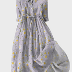 Elbűvölő hosszú ruha világos lila színben, tökéletes választás a friss és tavaszi megjelenéshez. A margaréták diszkrét mintázata fehér és sárga színben könnyedséget és örömöt ad minden naphoz.