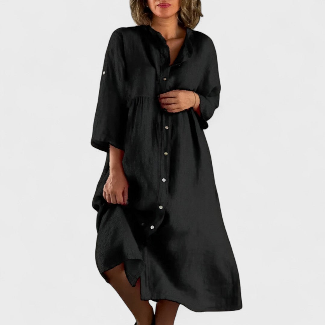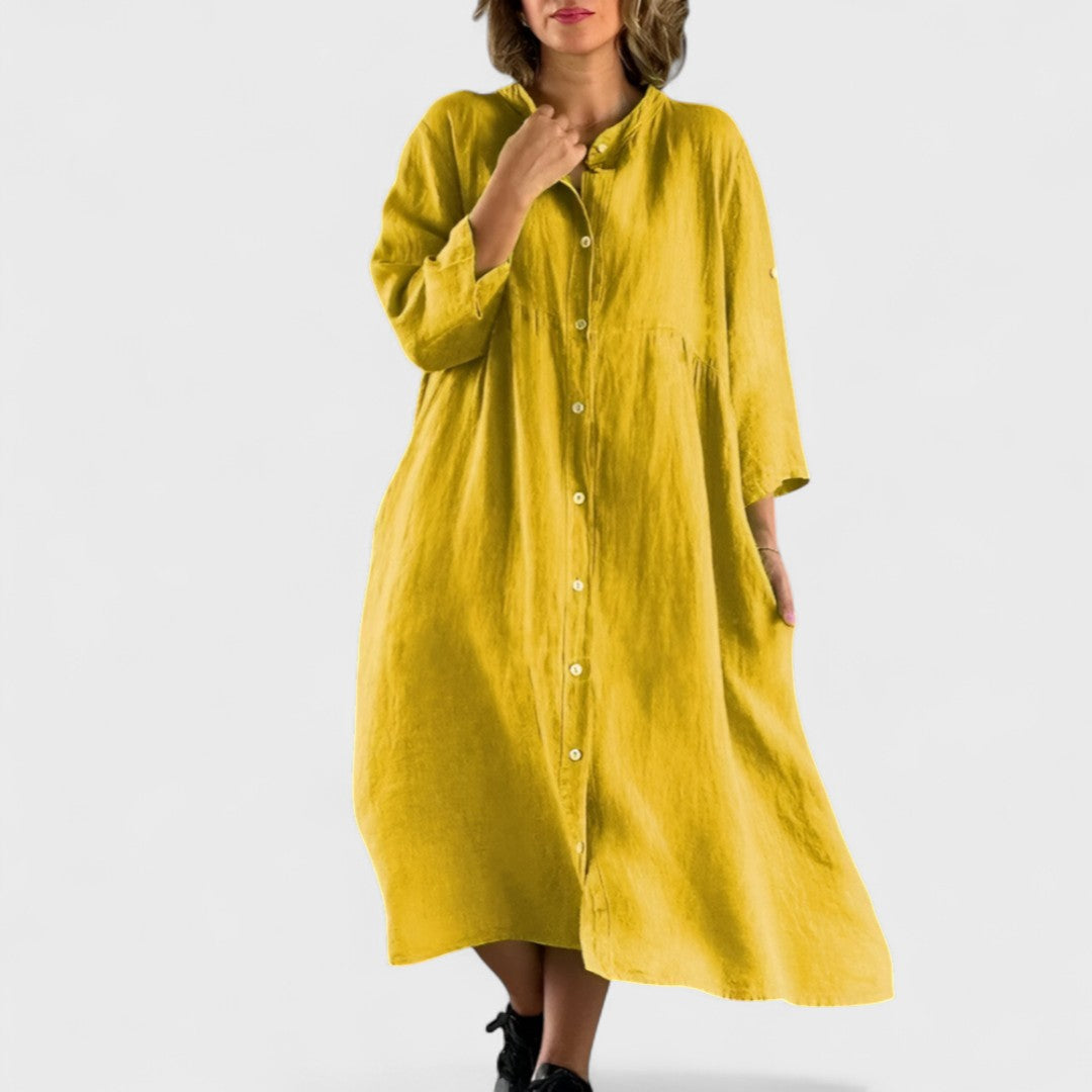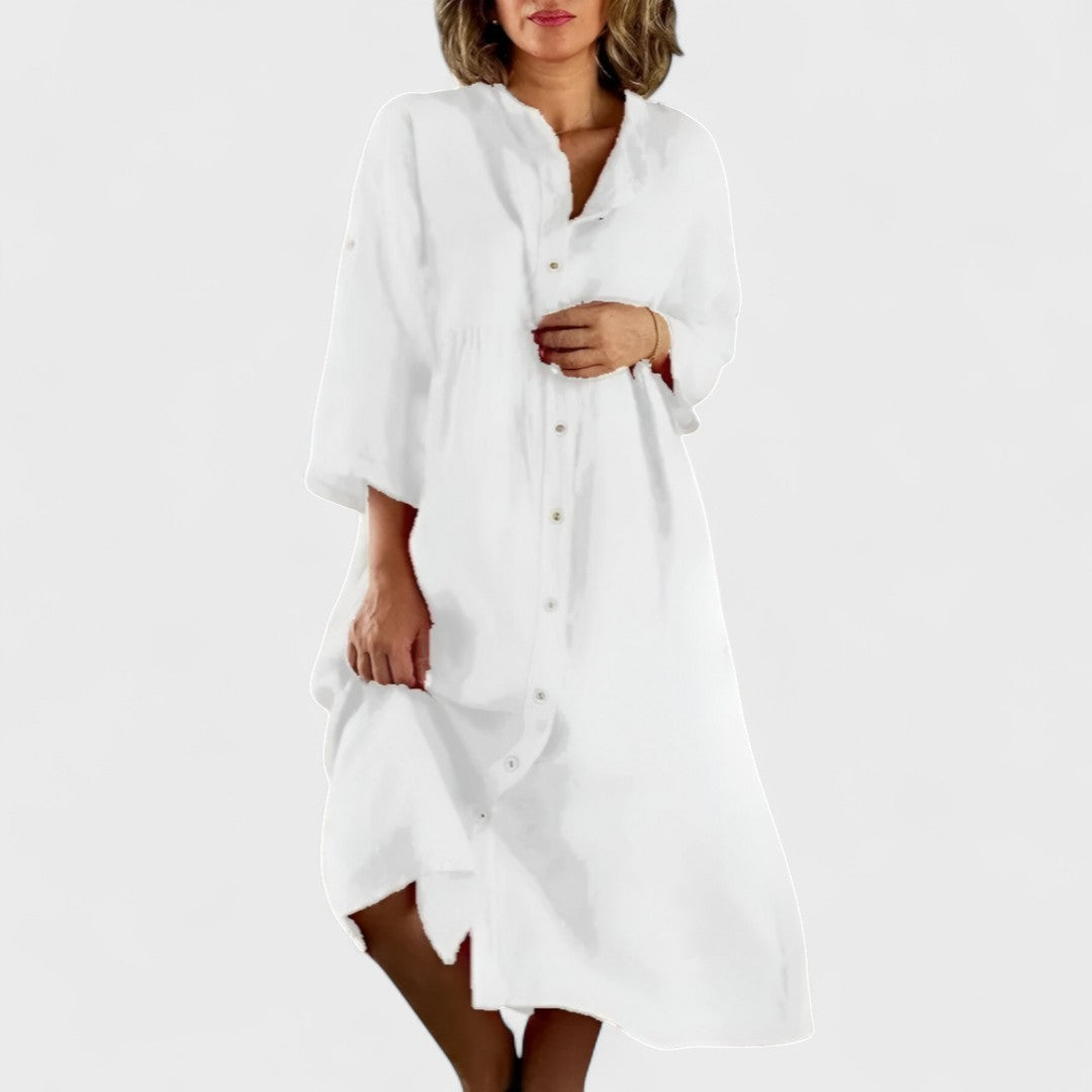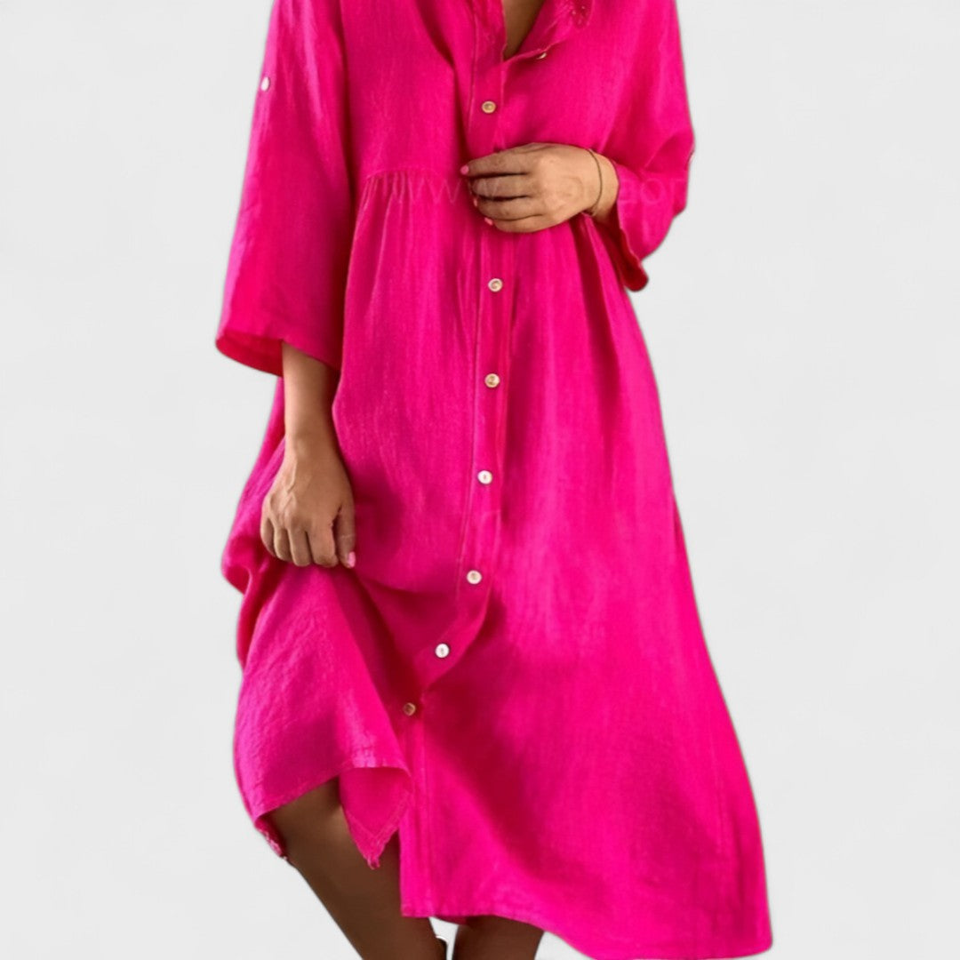 Az Isa ruha a tökéletes örök darab minden napra. Légies és kellemes anyaga, amely pamutot és lent kombinál, ideális választás a forró nyári napokra. Az inges szabás elegáns gombokkal és derékmegkötővel egy laza, de mégis nőies sziluettet teremt. Tökéletes választás városi sétákhoz, munkához vagy nyaraláshoz, ahol kényelmesen és stílusosan érezheti magát.