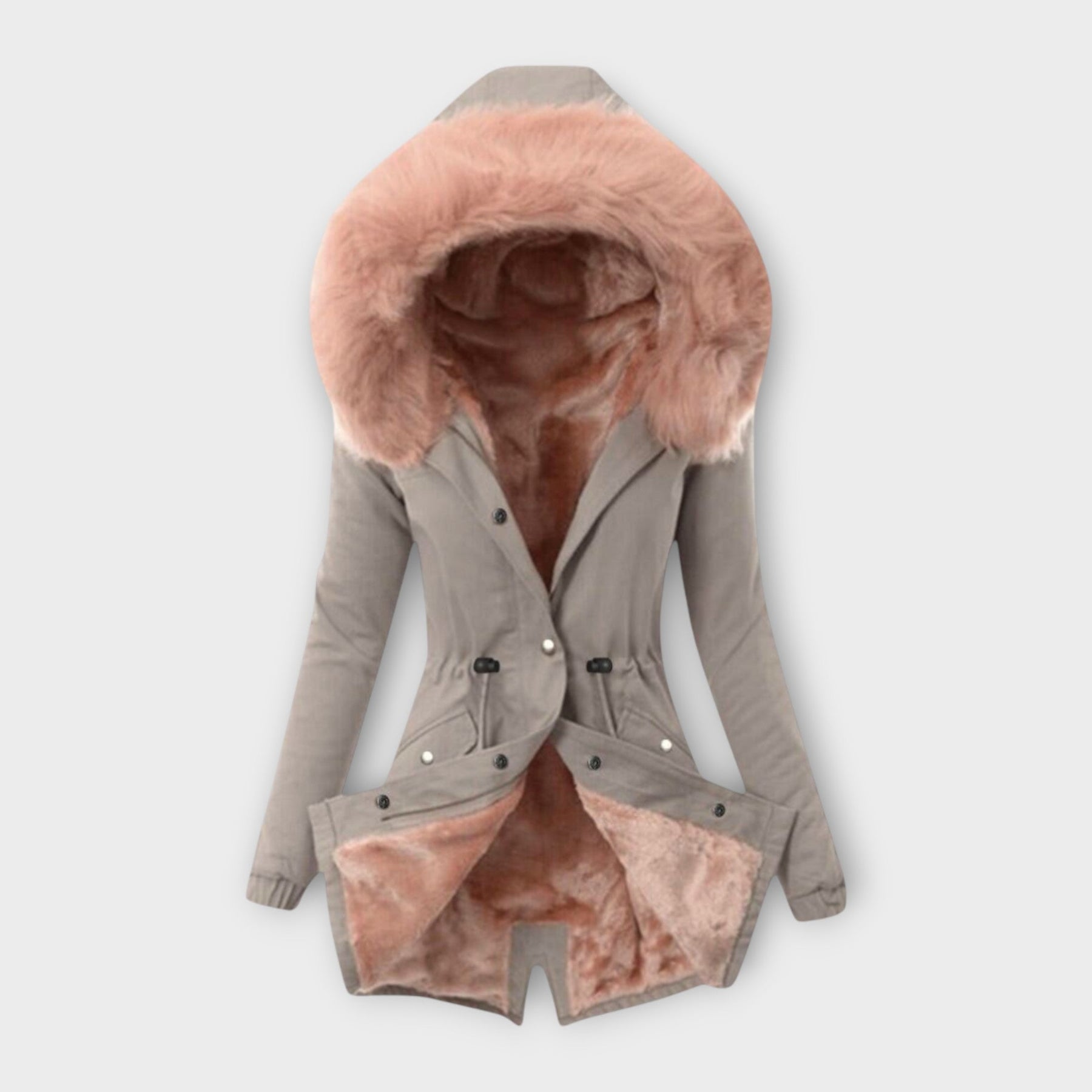 A tágas kapucni puha műszőrme béléssel van ellátva, amely nemcsak a szél és az időjárás ellen véd, hanem egy kis eleganciát is kölcsönöz.